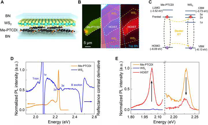 Two-dimensional (2D) materials offer strong light-matter interaction and design flexibility beyond bulk semiconductors, but an intrinsic limit is the low absorption imposed by the atomic thickness. A long-sought-after goal is to achieve complementary absorption enhancement through energy transfer (ET) to break this limit. However, it is found challenging due to the competing charge transfer (CT) process and lack of resonance in exciton states. Here, we report highly efficient ET in a 2D hybrid organic-inorganic heterostructure (HOIST) of Me-PTCDI/WS2. Resonant ET is observed leading to enhanced WS2 photoluminescence (PL) by 124 times. We identify Dexter exchange between the Frenkel state in donor and an excited 2s state in acceptor as the main ET mechanism, as supported by density functional theory calculations. We further demonstrate ET-enhanced phototransistor devices with enhanced responsivity by nearly 1000 times without sacrificing the response time. Our results expand the understanding of interlayer relaxation processes in 2D materials and open opportunities in optoelectronic devices.